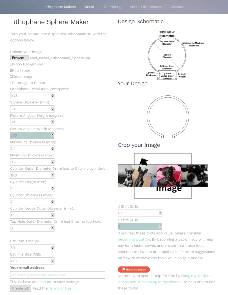 Now let’s cut the small useless talk and get to the point: Go to itslitho.com to see the new lithophane generator I’m talking about. It’s more feature-complete than the one I used in the earlier post, keep in mind this does not mean “it’s better”, for some people the other one is simpler and easier to use. This time I won’t be explaining every single feature of this editor, it has too many for lazy Muu? to show you. As you will see from the screenshot below, it does feature a preview window
